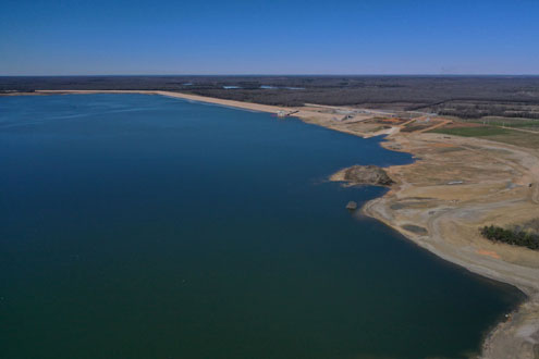 The remaining major construction efforts close to completion include work on the two-mile long dam, water treatment facilities, 60 miles of water pipelines, and over 17,000 acres of environmental and habitat improvements to offset the footprint of the lake. Environmental enhancements include planting of five million trees, stream restoration and reestablishment of natural wildlife habitats.
