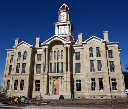 Over the course of his career, Wesley built fifteen courthouses, four school buildings, four churches and six jails. Throughout that time, Wesley remained committed to bringing order and civilization to Texas. In towns that had frame buildings, board sidewalks, and dirt streets crowded with horses and wagons, he built Second Empire Cathedrals of Justice from stone or brick with tall bell towers and ornate architectural details that gave the imposing structures character. He was building civic pride. Years later, a writer for Harper’s Magazine characterized one of Wesley’s courthouses as “a gem of its kind“ that “rises above the town like a cathedral in a town in France.” Today eleven of his surviving public buildings are on the National Register of Historic Places, testifying to the importance of his work. The newly restored Fannin County Courthouse should be the twelfth.