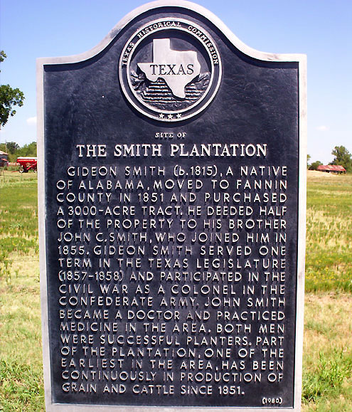 The only readily visible proof today of where Gideon Smith’s plantation was located is a Texas Historical Marker located on FM 247 near Mulberry, just a few miles west of the intersection of FM 247 and Highway 78, near Red River.