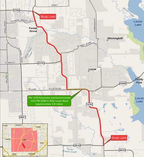 Collin County, Texas -- The Texas Department of Transportation (TxDOT) is conducting the Farm-to-Market (FM) 1378 Feasibility Study to evaluate the possibilities for widening and realigning FM 1378 from FM 2514 (Parker Road) north to FM 2786 (East Stacy Road), approximately 6.4 miles located in Collin County, Texas. The study will lead into further project development for the east-west section along West Lucas Road from FM 3286 Intersection Improvements Project to West Lucas Road, for approximately 0.8 miles.