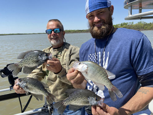 I began writing about retired Lake Lavon crappie guide Billy Kilpatrick a quarter century ago when he first began his almost quarter-century guiding career on Lake Lavon. I first fished with guide Brandon Sargent this past fall at Lake Ray Hubbard. This week, I was honored to join both guides on Lake Lavon for some springtime shallow water crappie fishing. Our goal was for me to get some footage for A Sportsman’s Life TV show for Carbon TV and for the two guides to ‘talk shop’. This was the first time for the guides to meet and they, as I expected, became fast friends.