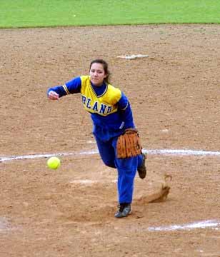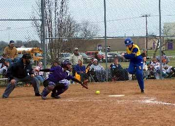 Too close for comfort...Bland's Sarah Poe jumps out of the way of an inside pitch.