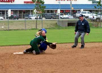 Umpire Ronnie Sadler watches Bland's Jessica Penney slide safely into second base.