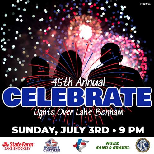 Bonham, Texas -- Lake Bonham will be the center of activities Sunday, July 3 as residents and visitors flock to the area to celebrate the 45th Annual Lights Over Lake Bonham Fireworks Show, presented by the Kiwanis Club, Bonham Chrysler, N-Tex Sand & Gravel, Jake Shockley State Farm Insurance, in cooperation with the City of Bonham, Texas.