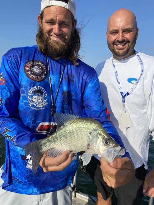 “Yesterday, we landed three limits of slab crappie from this one spot. Let’s see if they are still hungry,” says Brandon as we dropped live minnows into the huge school of crappie showing on the graph.