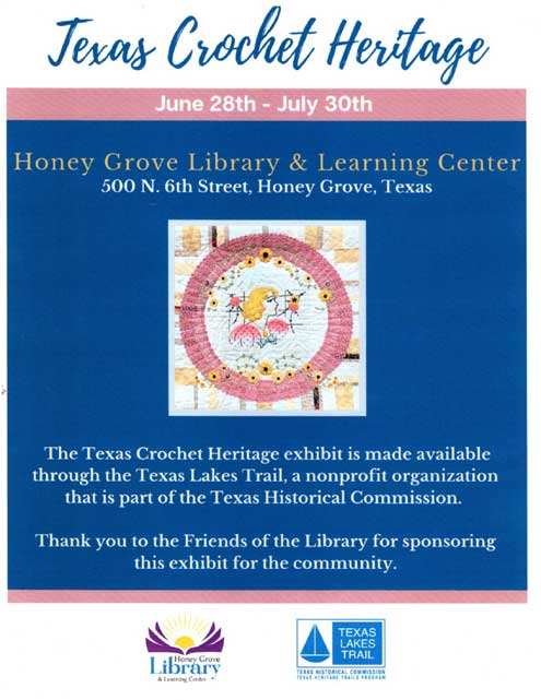 In addition, the Honey Grove Library and Learning Center has a very interesting exhibit on the art of crochet. The exhibit, featuring about 20 panels and crochet pieces from the community, can be visited when the Library is open (Friday – 10 am – 5 pm and Saturday, 10 am – 2 pm).