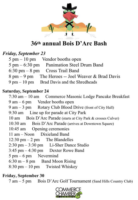 Entry to the Bash is FREE to the public (no gate charge) and proudly presented by the Commerce Chamber of Commerce and our generous sponsors. By City ordinance, dogs are not allowed on the square during the Bash.