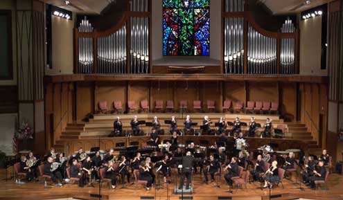 The “Pipe Dreams” MCB concert program features two pieces that do not feature the organ – “Symphonic Suite from Far & Away” by John Williams and “Sweet Hour of Prayer” by William Bradbury and arranged for MCB by band member Tom Evans who is the trumpet section leader. The remaining four pieces all feature Ghent on the church pipe organ.