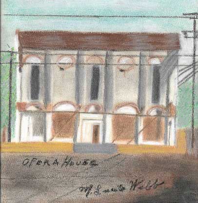 “The Opera House was a lovely place to go. There were elevated seats arranged in a half circle and two box seats at the ends of the stage, on the north and south. The stage faced west. There were rows of seats in the center, and the orchestra pit was in front of the stage. The box seats had beautiful red drapes. . . There was a large balcony upstairs called the ‘buzzards roost.’”