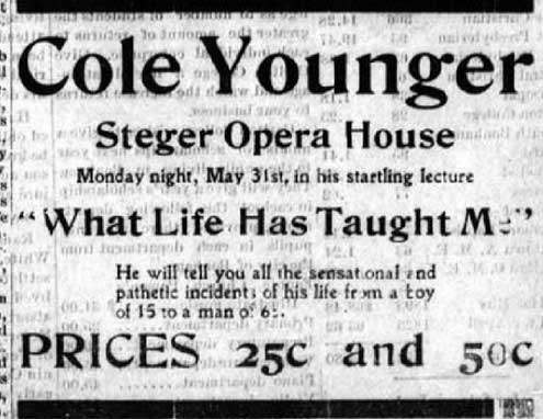 There were also addresses by well-known personalities, such as William Jennings Bryan and Cole Younger in 1909.