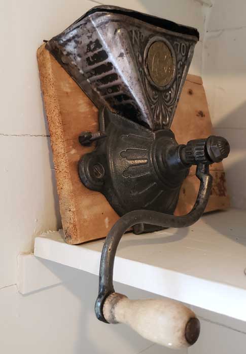 Two of the percolators come from the same company, Landers, Frary & Clark. Both of these are labeled “Universal,” a brand name that Landers, Frary & Clark would use. The Rayburns could also have possibly ground the raw coffee bean themselves, as they owned a hand cranked Charles Parker Co. Meriden, CT, no. 70 pepper grinder. The “70” refers to the hopper size (no. 70 was the was the largest model sold at the time). Apparently, the model owned by the Rayburn family was quite rare, signified by the gold medallion on the front of the hopper.