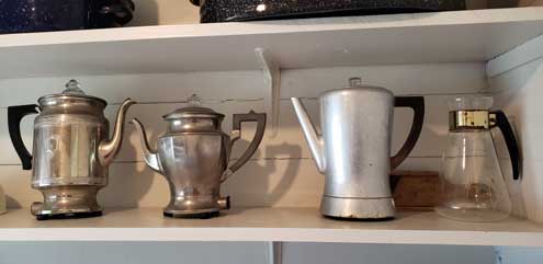 To move on to the coffee artifacts that we have on hand and on display here at the Sam Rayburn House, they are quite plentiful. The most direct evidence of the Rayburn caffeine kick is the number of, and the wear on, the coffee pots. If you visit you will find four coffee pots or percolators on display, spread across the kitchen, breakfast room, and pantry. Keeping in mind that the house probably had about a maximum of five Rayburns in it at any time, there are many more pots and percolators than the family probably needed at any one time.