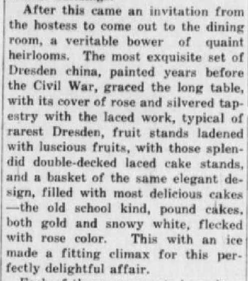 The ladies held elaborate luncheons and parties. The homes were lavishly decorated for these parties with flowers and beautiful dishes, and detailed write-ups about these parties were in the newspaper.