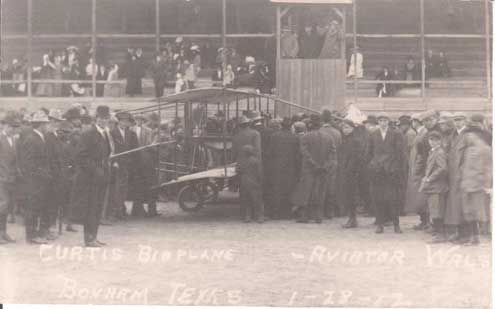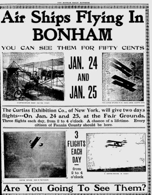 The Favorite reported in its January 25 edition that an “immense crowd witnesse[d] first aerial exhibition ever given in Bonham.” The exhibition was at the “old fair ground race course.” The “crowd that witnessed [the exhibition] was pleased and delighted, enthusiastically cheering the daring birdman on brilliant feats.”