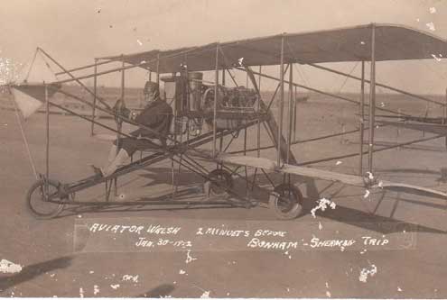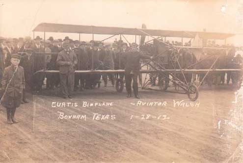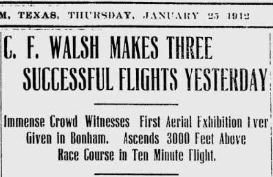 An article by Tom Scott says: A crowd estimated at over two thousand persons witnessed his arrival. Walsh took off down more than 150 feet of the dirt track for the first of his three flights of the day which brought "a roar of applause from the eager and anxious spectators;" as reported in The Bonham Daily Favorite. In the first flight Walsh attained an altitude of 800 feet in the plane, circling the entire fair grounds and demonstrating his versatility with loops, dips, and glides that lasted for ten minutes climaxing in a series of downward spiral glides landing within 50 feet of the racetrack grandstand.