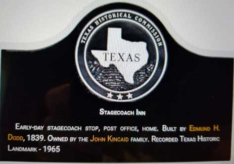 Over the years their log cabin would be used as a home, post office, stagecoach stop/inn and eventually evolved into a stately two-story home. Mrs. John Kincaid’s family, daughter of Edmund Dodd, who owned the property, received the above Texas Historic Landmark plaque in 1965 which included the house and log buildings. The house burned in October of 1976, but the 1840 log barn and other structures on the farm survived. After the fire, the Kincaid family donated the log barn known as a “DOG TROT” to the Fort Inglish Village in Bonham. These are the only buildings remaining from the original Dodd homestead and are about 183 years old. The picture below is a typical "dog trot" log structure in that time period.