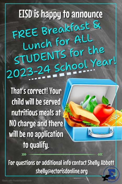 Ector, Texas -- Ector ISD announced a change to its policy for serving meals to the children served under the National School Lunch Program and School Breakfast Program for the 2023-24 school year. Schools qualifying to operate the Community Eligibility Provision (CEP) provide breakfast and lunch to all children at no charge and eliminate the collection of meal applications for free, reduced-price and paid student meals. This new approach reduces burdens for both families and school administrators and helps ensure that students receive nutritious meals.