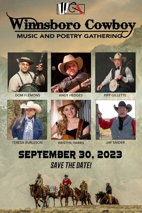 Winnsboro, Texas — Winnsboro Center for the Arts presents two music and poetry concerts at the 2023 Winnsboro Cowboy Music and Poetry Gathering on the Bowery in downtown Winnsboro on September 30. The shows are reminiscent of old cowboy storytelling that used to take place around a campfire during cattle drives. The performers tell stories, recite poetry, sing, and play instruments.