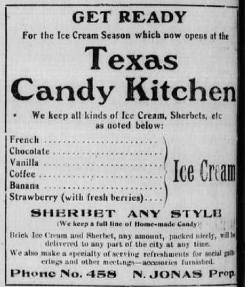 Nicholas Jonas moved to Bonham, Texas in 1912 and started working as the Proprietor of the Texas Candy Kitchen which was located on the north side of the downtown square, where the Moore Photography studio is located now.