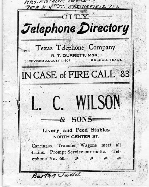 The Museum has a Bonham telephone directory for 1907 which shows 328 business and residential telephone numbers. By then, the telephone business had been sold and was renamed Texas Telephone Company.