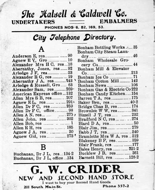 Bonham, Texas -- In 1890 the Fannin County Commissioner’s Court gave permission to J. N. Hughes to string telephone wire throughout the county. Soon many communities had telephone systems. In the decades that followed these systems were connected. Advertisements which mentioned telephone numbers were in the Bonham Daily Favorite as early as 1894. It appears that the first business to advertise a telephone service was that of the undertaker.