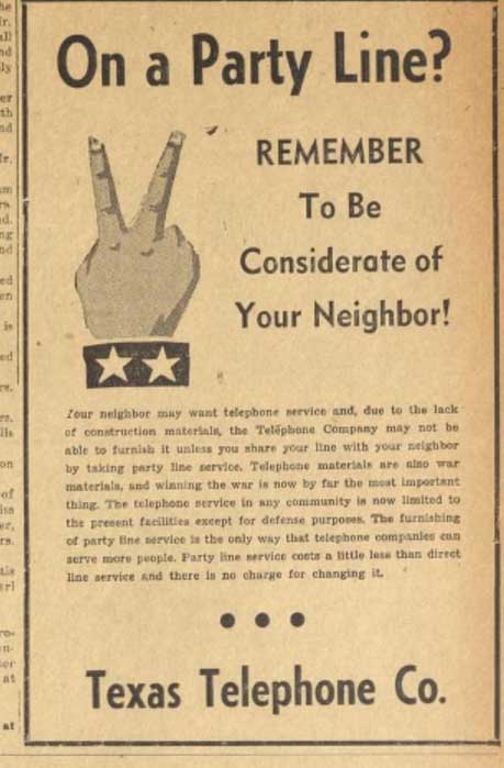 “Telephone materials are also war materials, and winning the war is now by far the most important thing. The telephone service in any community is now limited to the present facilities except for defense purposes. The furnishing of party line service is the only way that telephone companies can serve more people.” -- Bonham Herald, 11-19-1942.