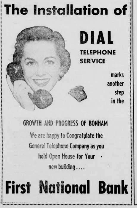 In December 1955 the Bonham Daily Favorite ran a series of articles on seven telephone company workers who had served the company for more than 25 years, including operators and a lineman. Several had worked for the telephone company since the 1920s. Telephone operators were well-known and respected members of the community.