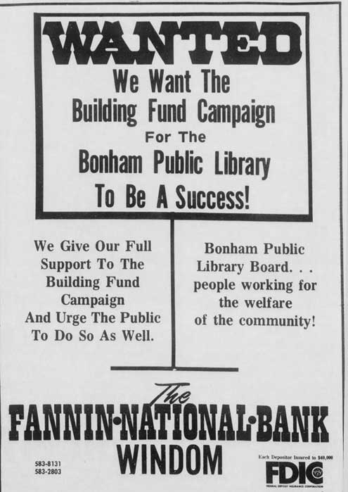 The Bonham Public Library is a dynamic institution with a wonderful staff that provides Bonham citizens with many cultural and educational resources. Bonham residents are rightly proud of their Library.