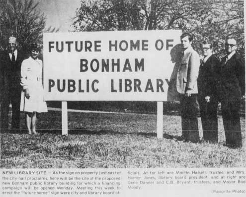 Bonham, Texas -- The citizens of Bonham have always valued education, so it is not surprising that they have supported a public library. The first public library was an outgrowth of the circulating library of the Current Literature Club, a women’s organization composed of twenty-five to thirty women who studied literature and the arts and initiated civic improvements.