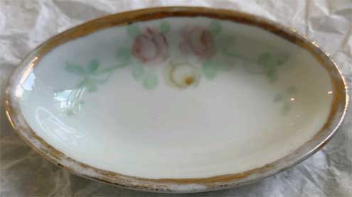 What could possibly be our oldest piece of china on display is a small, delicate salt dish crafted by O&E.G. Royal of Austria in 1918 or earlier. The “O&E.G.” stands for brothers Oscar and Edgar Gutherz.