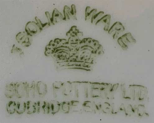 Soho Pottery Co., Ltd. to Simpsons (Potters) Ltd. in 1944. Soho’s original location in Tunstall and later Cobridge are both part of the city of Stoke-on-Trent in England, a famous hub of pottery makers in the nation. The Solian Ware line existed at least in 1909, and likely earned a maker’s mark by 1913.