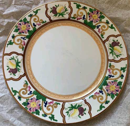 The marking on the Rayburn plate was used until about 1930. In 1913, an article in The Pottery Gazette reported that the Solian Ware “has made its way into the very best houses, probably by reason of the extreme whiteness of its body and the brightness and up-to-dateness of its designs.” Our white plate decorated with drawings of flowers and fruits in colors of gold, pink, green, blue, red, and purple certainly displays a bright, vivid image.