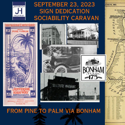 Bonham, Texas -- The Bonham Visitor Center is excited to announce that we will be designating Bonham’s section of the historic Jefferson Highway with historic site sign dedications, historic route sign dedications, and sociability rally on Saturday, September 23, 2023.