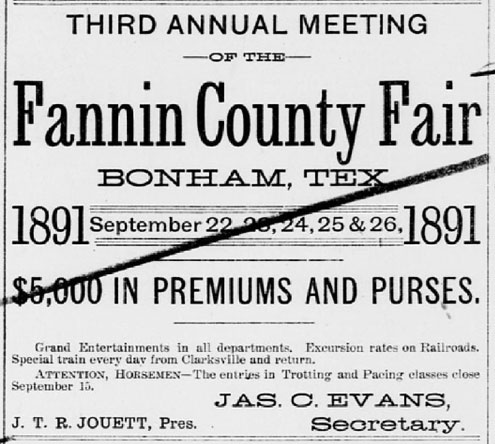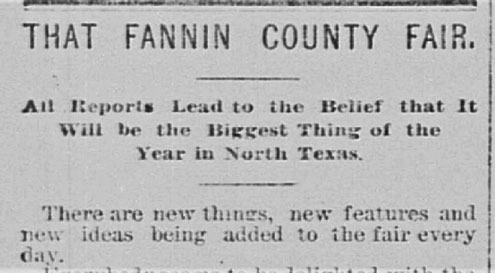 We are lucky to have quite a lot of information about the remarkable Fannin County Fair of 1891. This is NOT because we have copies of local newspapers for that year – we do not. This is because statewide newspapers carried stories about the 1891 Fannin County Fair, “the biggest thing of the year in North Texas.”