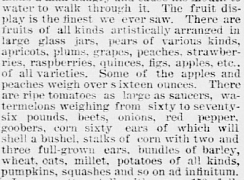 There was an amazing display of fruits and vegetables. Who knew all these fruits were grown in Fannin County: pears, peaches, apricots, plums, grapes, strawberries, raspberries, quinces, figs, apples. And ripe tomatoes as large as saucers.