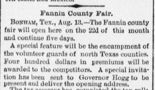 Bonham, Texas -- Since at least 1870 there had been interest in holding a county fair in Fannin County. The Houston Telegraph reported in 1873 that the Fannin County Fair would be held in the fall for 4 days. The Galveston Daily News reported in 1876 that there were 20 county fair associations in Texas, and The Fannin County Fair Association was one of them.