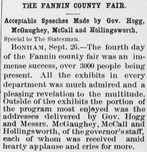 Even the Governor of Texas, James Hogg, came to the 1891 Fannin County Fair. We must assume that he arrived on the train at the depot and took the streetcar to the Fair. Did he spend the night in Bonham? So many questions, and no local newspapers!