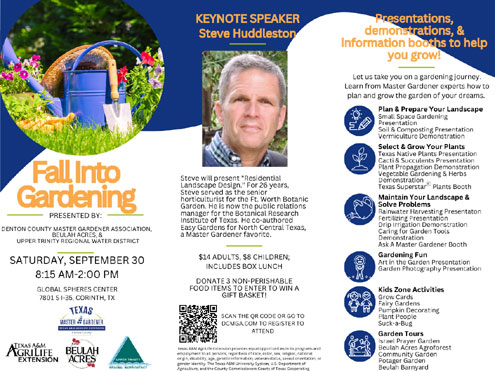 Corinth, Texas -- "Fall Into Gardening," presented by the Denton County Master Gardeners and Beulah Acres, and sponsored by Upper Trinity, will be held on September 30 from 8:15 a.m. to 2:00 p.m. in Corinth!