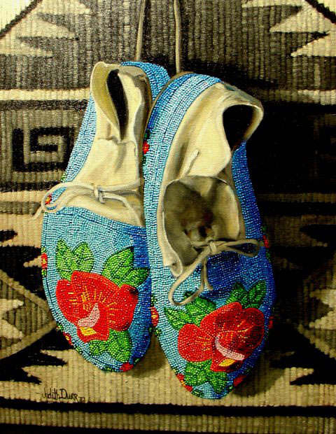 The artwork on display includes originals from Judith Durr, Lauretta Newby-Coker, Courtney Siseros, Norma Howard, Connie Phillips, Jane Semple Umsted and Gwen Coleman Lester. There are also reproductions of Nancy Rhoades, Lester and Umsted. The exhibit includes a special touch – handmade moccasins by Brad Joe.
