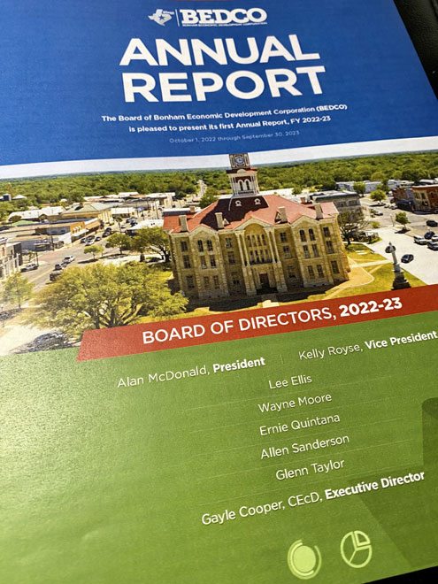 Cooper handed out copies of the BEDCO Annual Report. She stated she believes in transparency and wanted to report on where the BEDCO money has been spent. Sales taxes account for 63.3% of BEDCO’s annual income. Last year, expenses included 20% for the Highway 121 property improvements, 17% for airport improvements, 16% for city infrastructure and 9% for downtown grants. The annual report is also posted on the BEDCO website: https://www.cityofbonham.org/DocumentCenter/View/1603/Annual-Report-2023