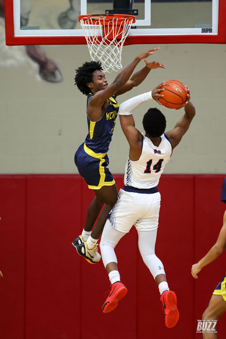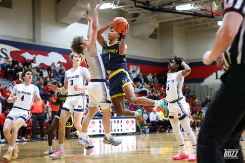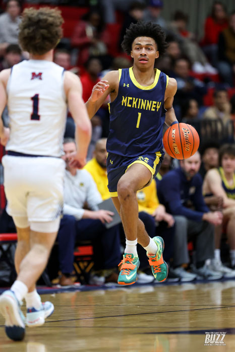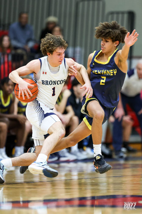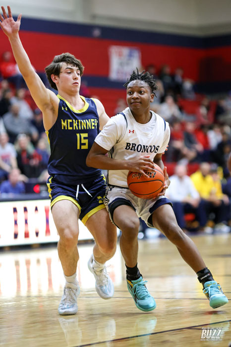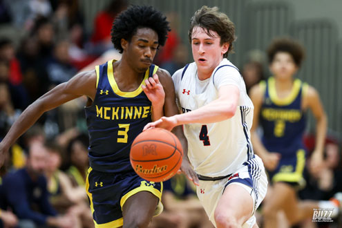 McKinney High's Quintel Wilson (3) attempts to block a shot by McKinney Boyd's Parker Brown (14).