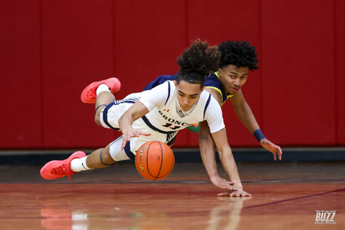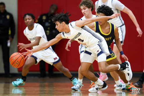 McKinney High's Malik Archie (1) grabs McKinney Boyd's Joseph Hansen (0) on Friday, January 5, 2024 at McKinney Boyd High School. The McKinney High Lions won the game 68-62.