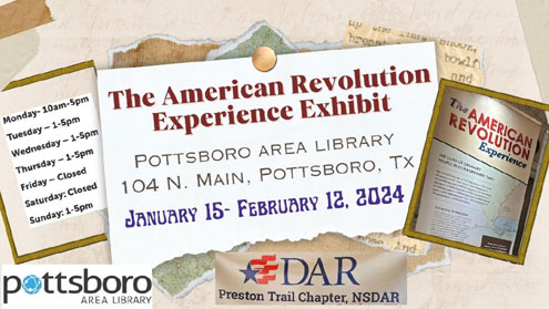 Pottsboro, Texas — The Preston Trail Chapter, NSDAR is excited to announce an opening reception of the American Revolution Experience at the Pottsboro Area Library on Wednesday, January 17, 2024 from 5:00-6:00 p.m. This reception is open to the public and will feature the first public viewing of the exhibit, along with a photo opportunity with DAR ladies dressed in Revolutionary costumes.