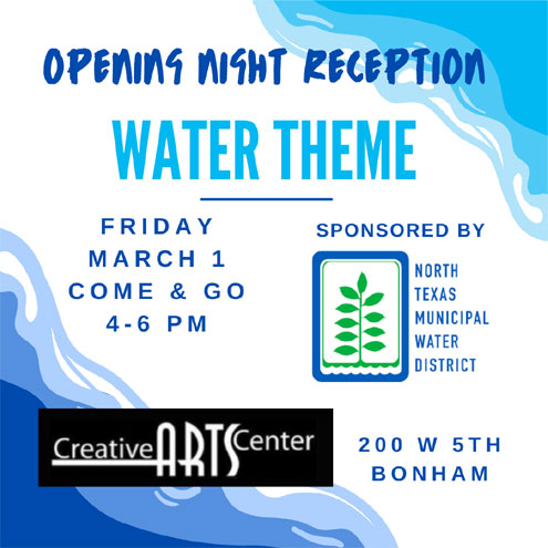 Bonham, Texas -- The Creative Arts Center in Bonham is pleased to host Art Exhibit Opening Receptions on the first Friday of every month. The next event is coming up quickly on Friday, March 1. The theme for this month’s exhibit is "water." North Texas Municipal Water District is sponsoring this opening night reception.