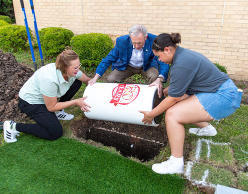 Student Assembly President Nia Carter ’25, opened the ceremony by welcoming attendees and discussing some of the items sealed inside the capsule, including letters from presidents of Greek organizations, posters from campus events, a list of all students, eclipse glasses, students’ letters to their future selves, and a crocheted ’Roo. “Student Assembly wanted to find a way to get the entire campus to participate in the celebration of 175 years of Austin College,” she said. “We are elected representatives of the Student Body, and we wanted to make Heidi Rushing, Steven P. O’Day, and Nia Carter place the capsule in the ground.sure that everyone had a chance to make an impact on this momentous occasion!”