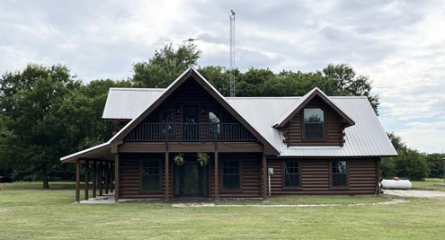 Bonham, Texas -- Beautiful 3 bedroom 2 bath log home sitting on 8+ acres. Gourmet kitchen with granite peninsula, multiple cabinets, and walk in pantry. Two story slate gas fireplace to keep you warm on those chilly evenings. Wrap around porches to enjoy the evening air or move up to the front or back elevated decks.