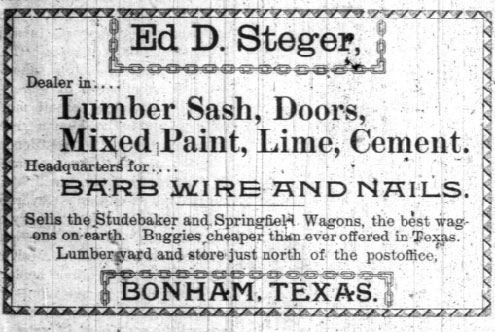 Advertisements for various barbed wires were published in local newspapers, such as this advertisement from Ed Steger published in the Bonham News from August 21, 1896.