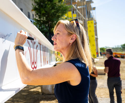 University leaders and representatives of AECOM Hunt construction and SmithGroup architects took part in a topping off ceremony, which celebrates placement of the final beam in a building project. Attendees signed their names to the beam, which in the coming weeks will be set into place.