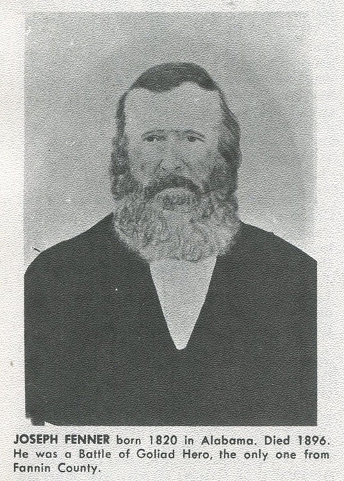 Joseph Fenner and his brother Robert left Alabama in 1836 to help Texas fight for independence. Joseph was 15 years old. Robert was killed at Goliad, but Joseph survived.