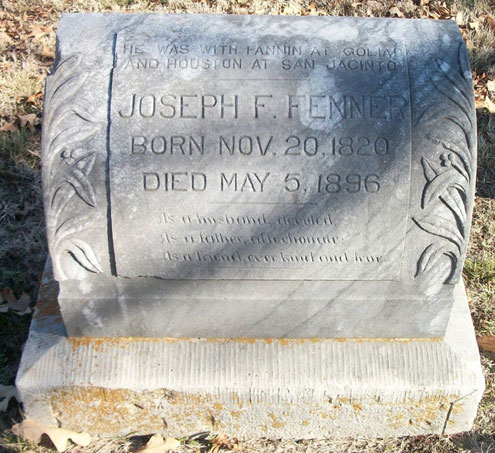 According to Ruth Leslie Barrett, there is no record of Joseph Fenner’s service “with Houston at San Jacinto” and he did not claim that service in his pension request. “It must be accepted that Mary Fenner [Joseph’s wife] based the inscription she used on her husband’s tombstone only on his personal testimony to her.”